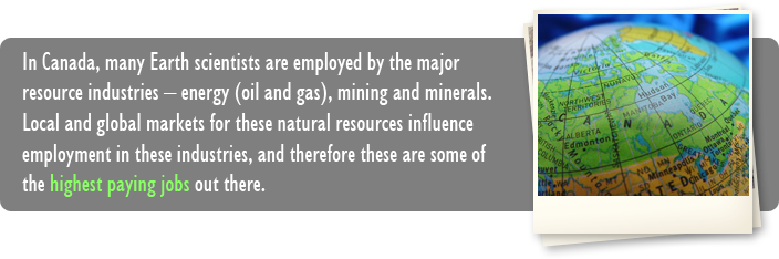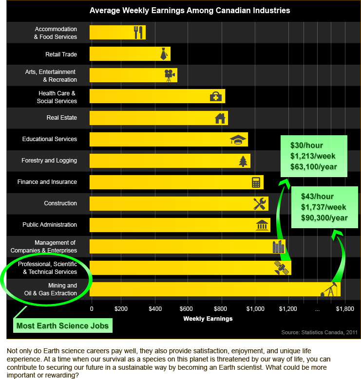 Earth science jobs are some of the highest paying jobs out there. The minimum wage across Canada ranges from $9.50 to $11 per hour. But Earth science students graduating with a university degree, college diploma, or technical certificate can expect to earn around double this as soon as they start working! With experience, training, and added job responsibility, their income quickly rises.